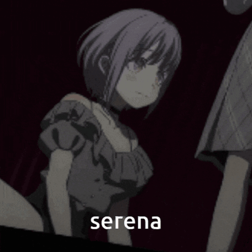 a girl with purple hair is standing next to a man and the word serena is on the screen .