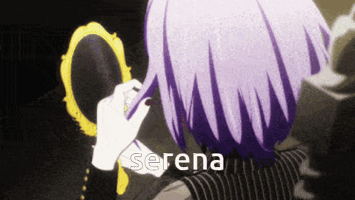a girl with purple hair is looking at herself in a mirror and the word serena is above her head