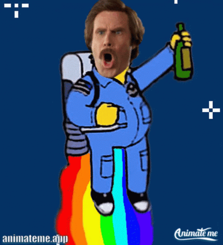 Will Ferrell's Anchorman face on a cartoon astronaut with a rainbow jetpack, holding a bottle.