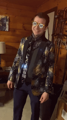 Man in a snazzy, light-up New Year's Eve suit jacket, "2020" glasses, and "Happy New Year!" tie.