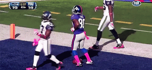 A New York Giants player, likely Victor Cruz, celebrates a touchdown on the field with pink accents.