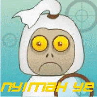 A funny cartoon ghost (pocong) with a magnifying glass, intently observing with yellow eyes.