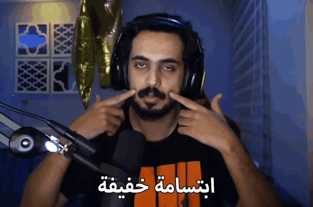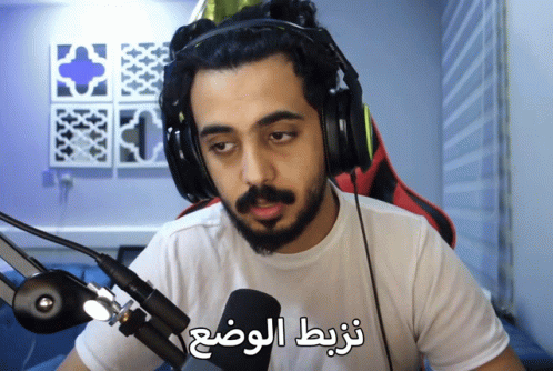 A man wearing headphones talks into a microphone, with Arabic text "Let's fix the situation" on screen.