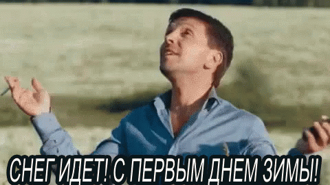 A man from 'What Men Talk About' wishes a happy first day of winter as snow falls, a classic Russian meme.