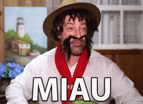 Comedian Cris Pereira, in character with a hat and mustache, makes a 'MIAU' expression.
