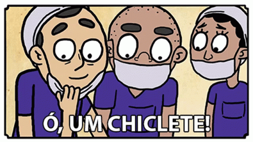 Three cartoon surgeons in masks react with disgust to finding a piece of chewing gum during an operation.