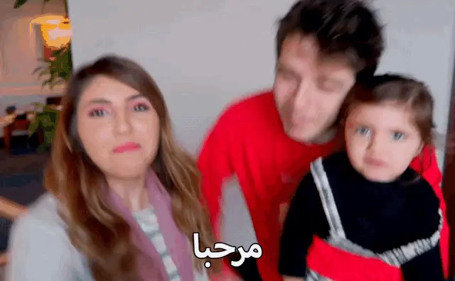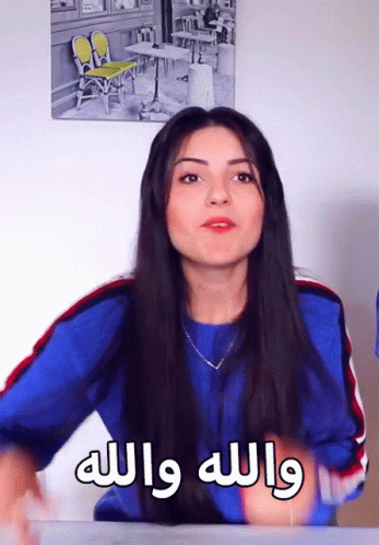Young woman emphatically saying 'By God, I swear' with hand gestures, wearing a blue and red sweater.