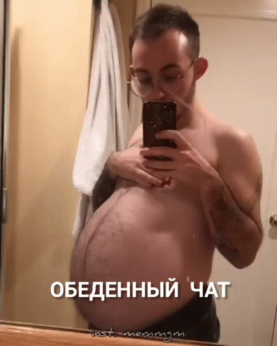 A shirtless man takes a mirror selfie, showing his distended belly, with the Russian caption "LUNCH CHAT".