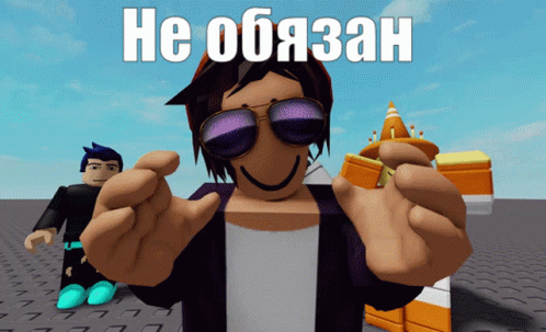 Roblox characters pose with the phrase "Не обязан" (Not obliged) displayed, showcasing various avatars.