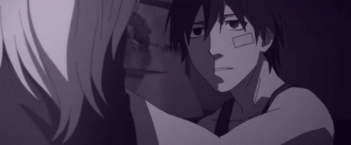 An anime couple shares a tender hug in a dimly lit room, a moment of comfort and affection from Darker Than Black.