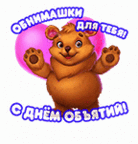 A cute cartoon bear with hearts, wishing 'Hugs for you!' and 'Happy Hug Day!' in Russian.