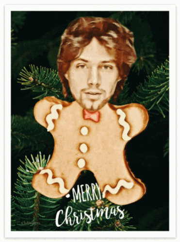 Whiteyy18's face superimposed on a festive gingerbread man, wishing 'Merry Christmas' against a pine tree background.