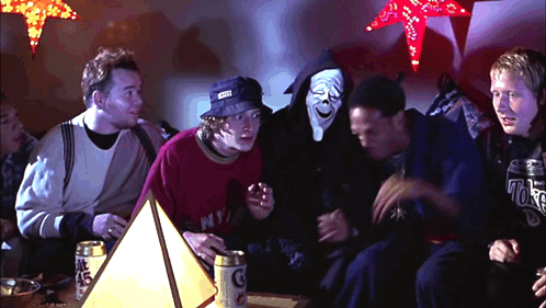 Ghostface and a group of friends laugh hysterically at a party, a scene from Scary Movie.