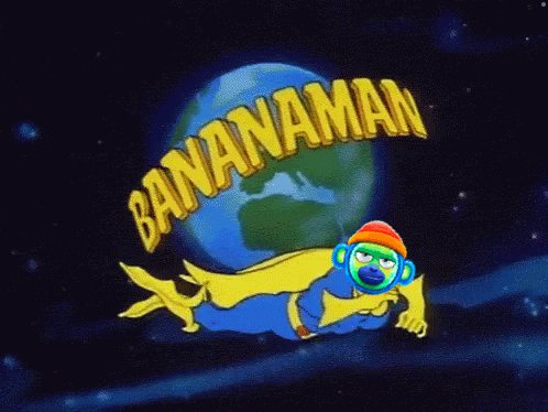 Ocm Onchainmonkey, a Bananaman-like superhero monkey, flies through space in front of a globe.