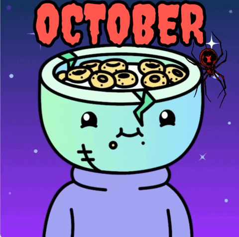 A spooky cartoon character with a cereal bowl head and a spider, celebrating October and Halloween.