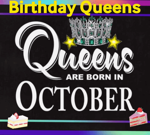 A vibrant graphic celebrating 'Birthday Queens' born in October, featuring a crown and cake slices.
