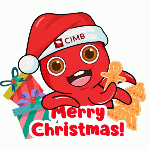 A cheerful CIMB octopus in a Santa hat holds a gingerbread man, wishing everyone a Merry Christmas.