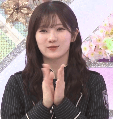 a woman in a striped jacket is clapping her hands in front of flowers .