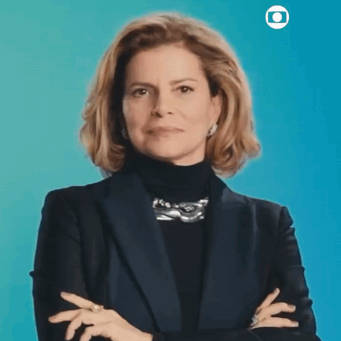 Débora Bloch as Odete Roitman, with arms crossed, eyes closed then open, against a blue background.