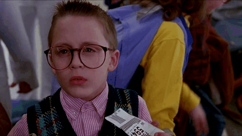Kevin McCallister from Home Alone 2, wearing glasses and holding a boarding pass, looks surprised.