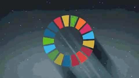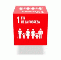 Red cube displaying '1 FIN DE LA POBREZA' (End Poverty) and family icons, representing Sustainable Development Goal 1.