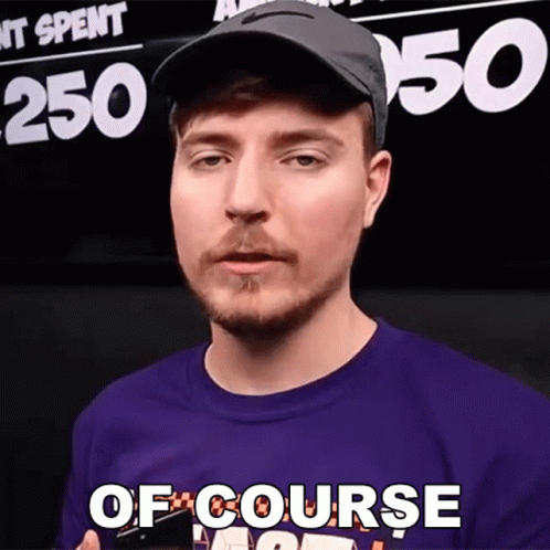 Jimmy Donaldson, known as MrBeast, reacts with 'Of Course' while wearing a purple shirt and a cap.