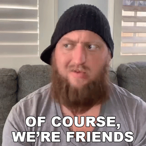 Dj Hunts shares a friendly message, stating 'Of Course We're Friends' while sitting on a couch.