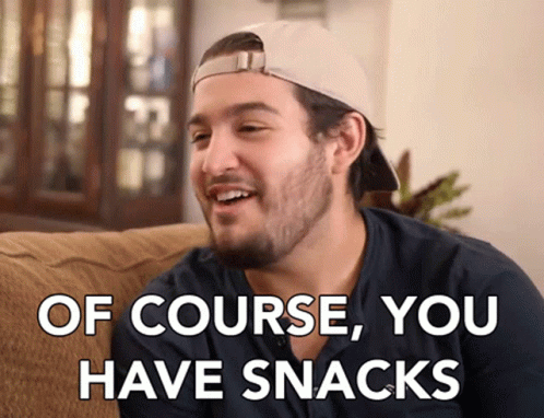 A man on a couch smiles as the caption 'OF COURSE, YOU HAVE SNACKS' appears, a popular food and snack meme.