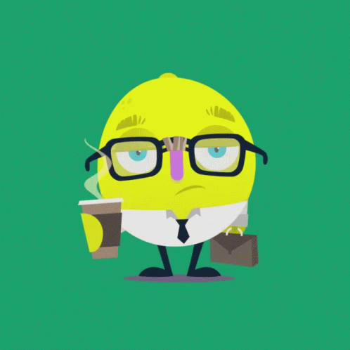 Mr Lemonade, a tired cartoon lemon in glasses and office attire, holds a steaming coffee cup and briefcase.