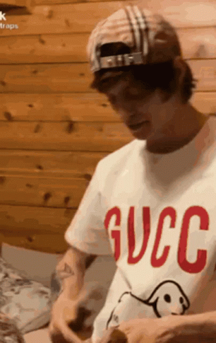 OG Buda, wearing a Gucci t-shirt and Burberry hat, counts a stack of money.