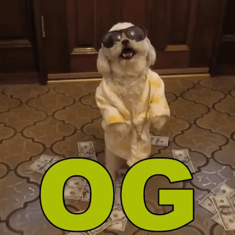 A dog wearing sunglasses and a robe, standing amidst piles of money, embodying an "OG" gangster persona.