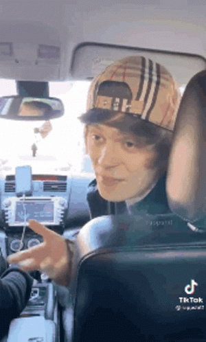 Russian rapper Og Buda in a car, wearing a plaid cap and making a funny face.