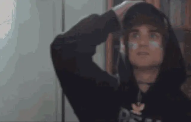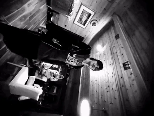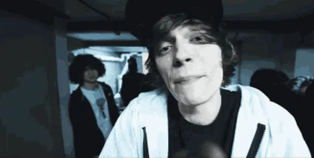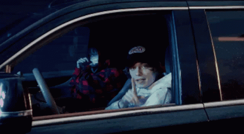 Og Buda and another person in a car at night, with Og Buda pointing at the camera.