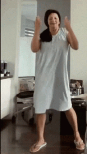 Ogie Regine dances cheerfully in a light blue gown and flip-flops in an indoor setting.