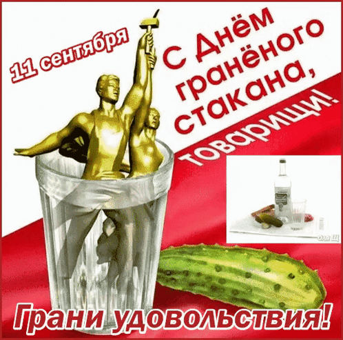 A Soviet-style poster celebrating September 11th as 'Faceted Glass Day,' featuring a golden statue, a cucumber, and vodka.