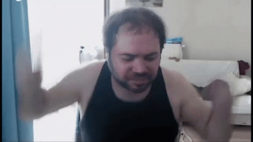 Oğuz Sasi making a funny face with arms outstretched in a living room.