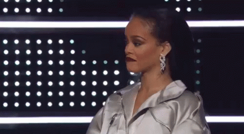 Rihanna in a silver jacket and earrings, showing a subtle reaction during an event.