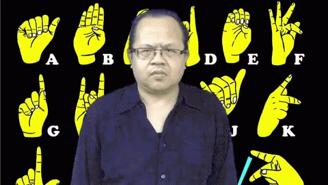 A man demonstrates the 'Oh Dieu' sign language gesture, covering his face in front of an alphabet background.