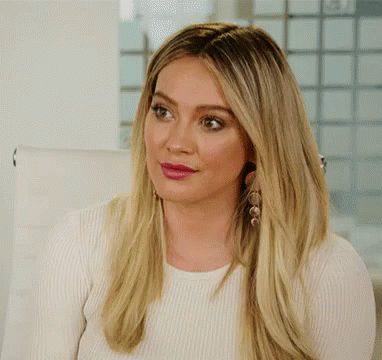 Hilary Duff gives a subtle, sarcastic half-smile while looking to the side, wearing a white sweater.