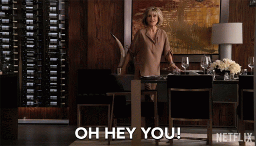 Jane Fonda, as Grace Hanson, greets viewers with "Oh Hey You!" in a stylish room from Grace and Frankie.