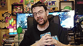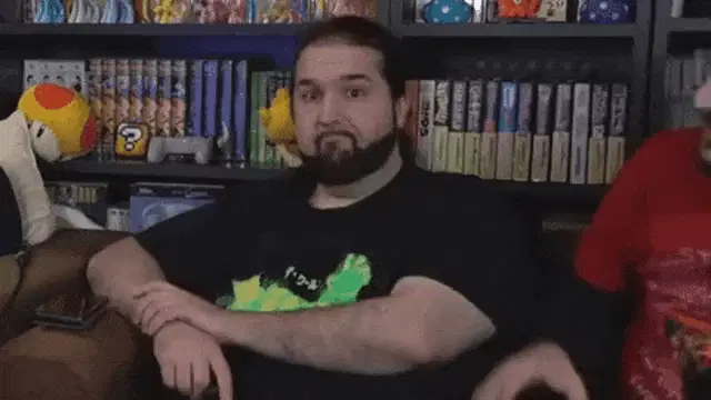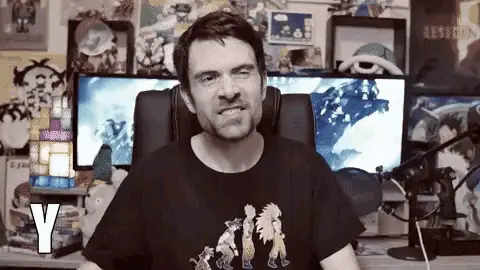 Joueur du Grenier reacts with an 'Oh my god...' expression while sitting in front of computer monitors.