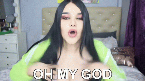 Diana Estrada reacts with an enthusiastic 'Oh My God' while sitting in front of a bed, expressing excitement.