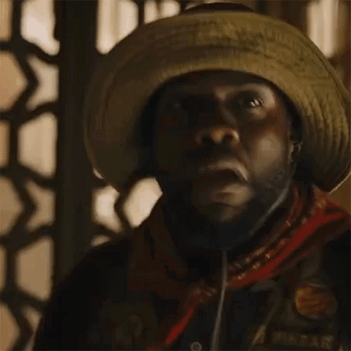 Man in a hat with a shocked expression, reacting to an 'Oh My God Fridge' moment from Jumanji.