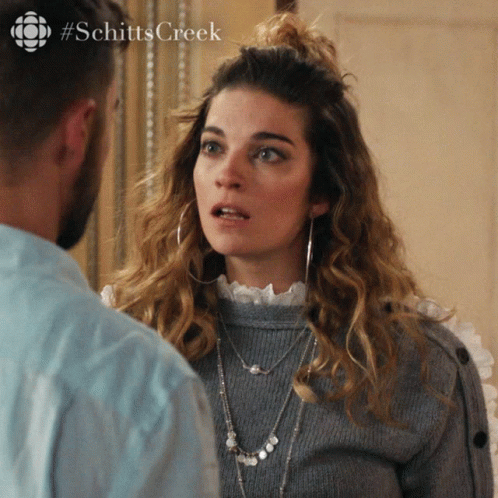 Alexis Rose from Schitt's Creek reacts with a surprised 'Oh My God' expression.