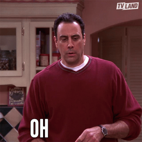 Brad Garrett as Robert Barone reacts with 'Oh My God!' in a kitchen, looking shocked.
