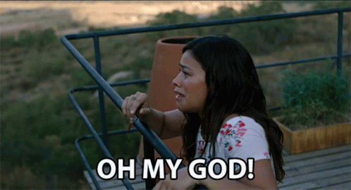 Gina Rodriguez as Gloria Fuentes cries 'Oh My God!' in a moment of intense distress on a balcony.