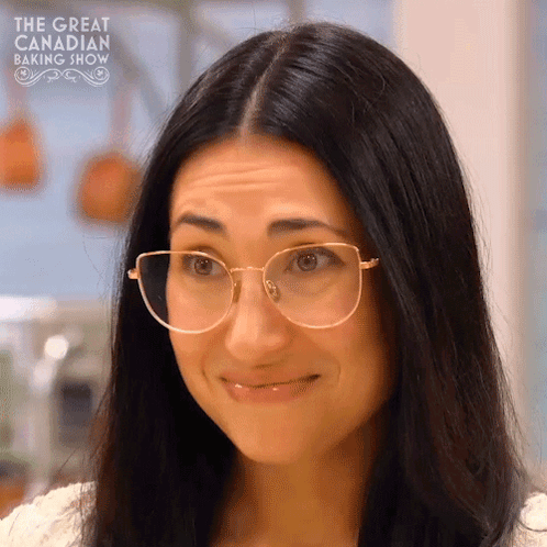 Pamela reacts with 'Oh My God!' on The Great Canadian Baking Show, wearing glasses and looking surprised.