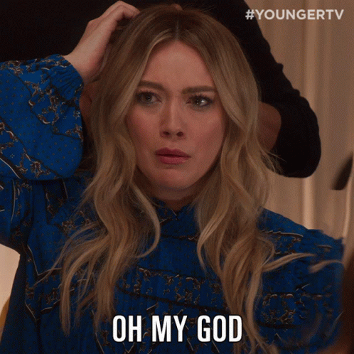 Hilary Duff as Kelsey Peters reacts with 'Oh My God,' looking stressed and worried in a blue dress.