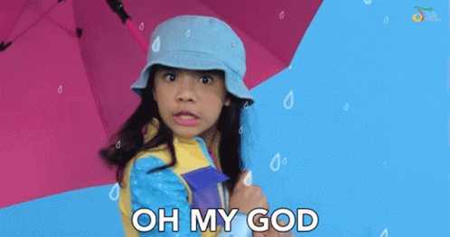 Neona reacts with surprise, exclaiming 'Oh My God' while holding an umbrella in the rain.