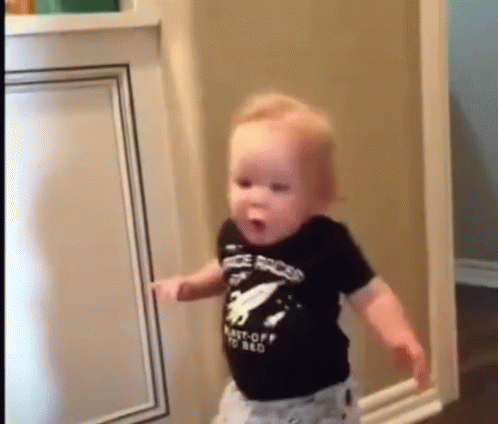 A baby with light hair, wearing a rocket shirt, reacts with a surprised "Oh No" and quickly moves away.